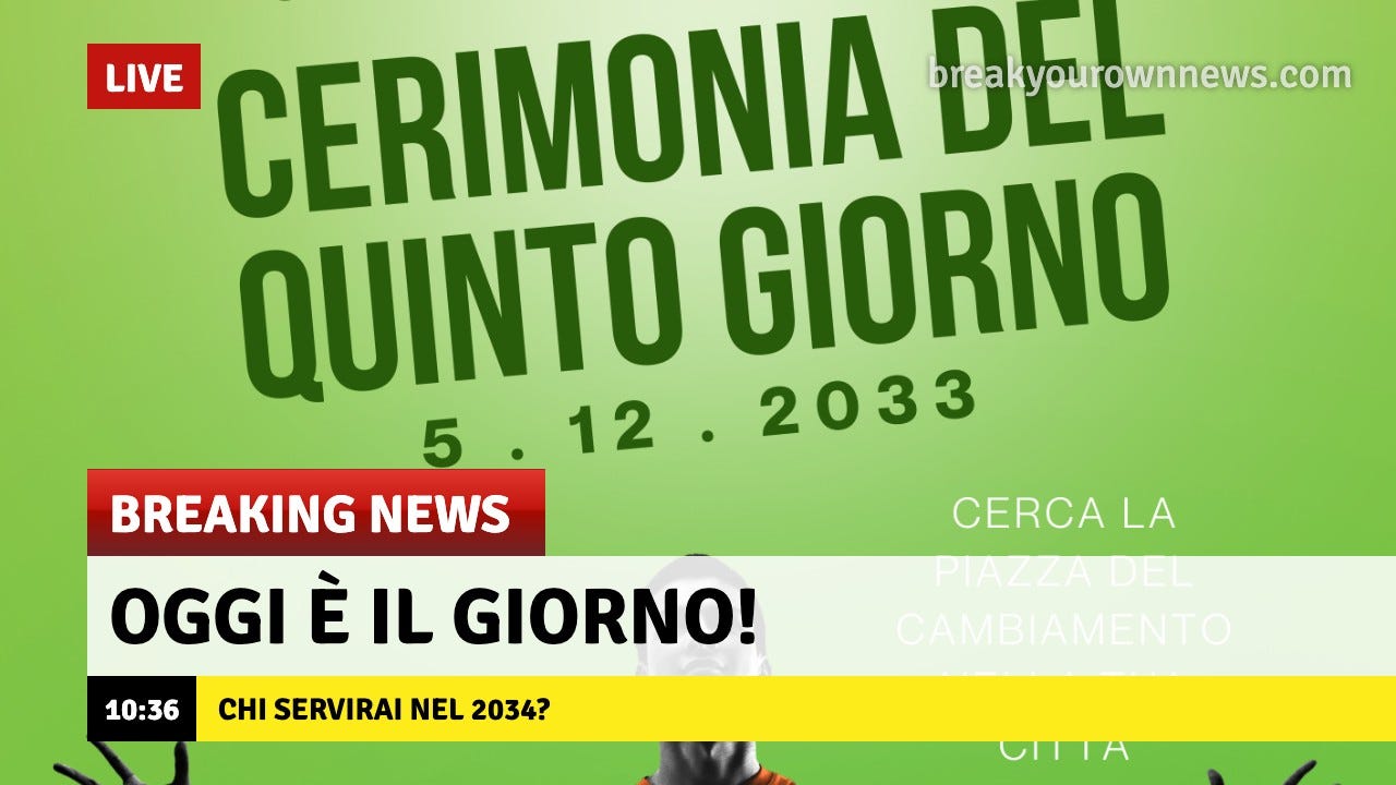 È il 5 dicembre 2033, Giornata Mondiale del Volontariato. Per il secondo anno consecutivo partecipo alla Cerimonia del Quinto Giorno, un evento che si svolge contemporaneamente in tutte le principali piazze delle nostre città: oggi scelgo a quale causa e a quale Ente del Terzo Settore donare il mio quinto giorno "ex-lavorativo" per il prossimo anno, il 2034.